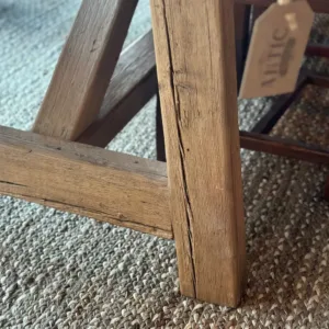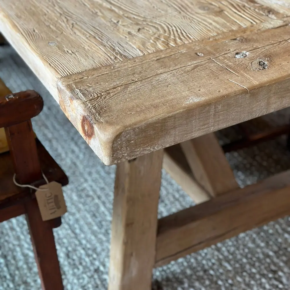 Su estructura en forma de caballetes aporta robustez, sencillez y equilibrio estético, perfecta tanto para casas de campo como para interiores con estilo contemporáneo que buscan autenticidad.