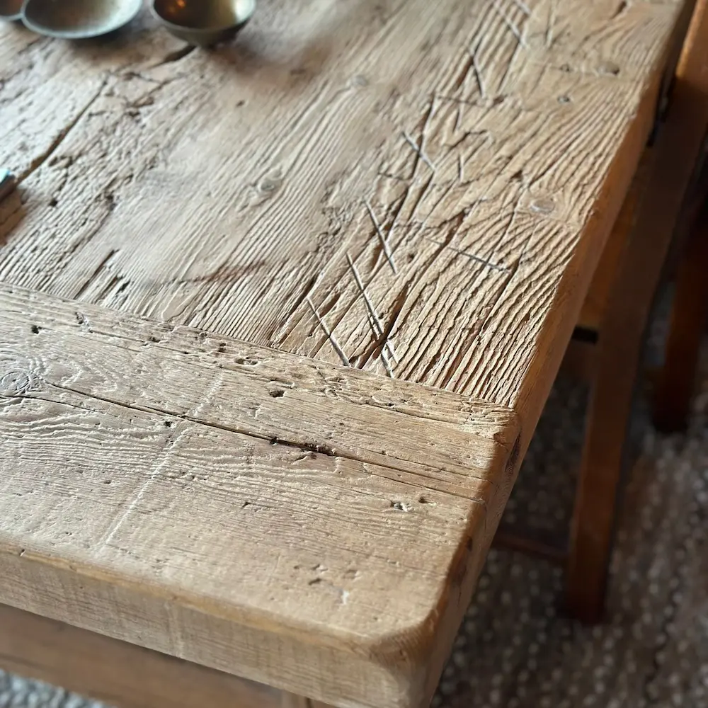 Fabricada en madera de pino viejo recuperado, presenta un sobre sólido con 5/6 cm de grosor, trabajado con listones horizontales en las puntas que remarcan su carácter artesanal.
