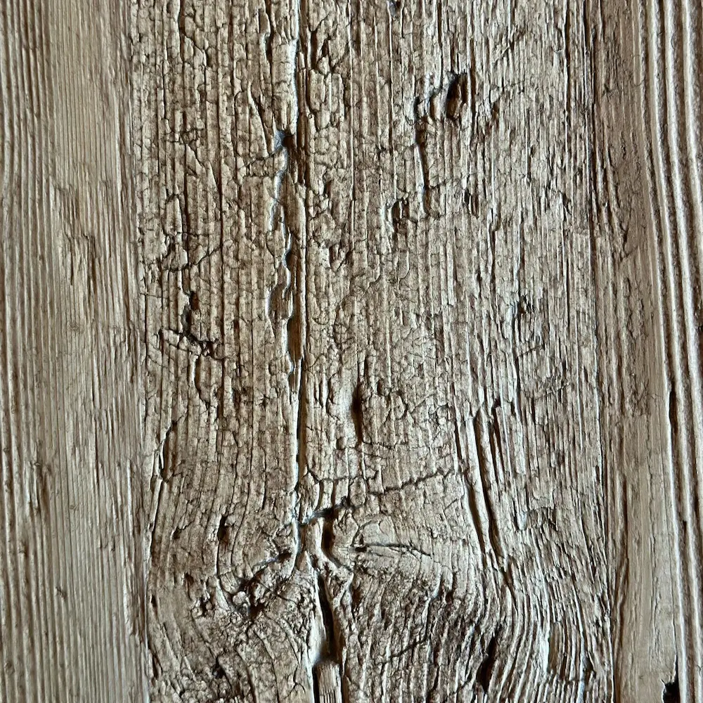 El acabado rústico T003 en tono tostado resalta la textura natural de la madera, con sus marcas, vetas y huellas del tiempo, ofreciendo una pieza con personalidad única.