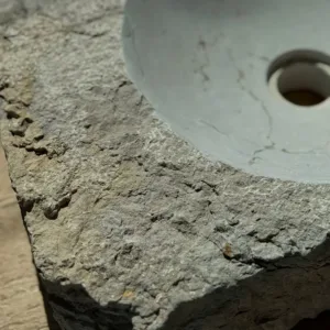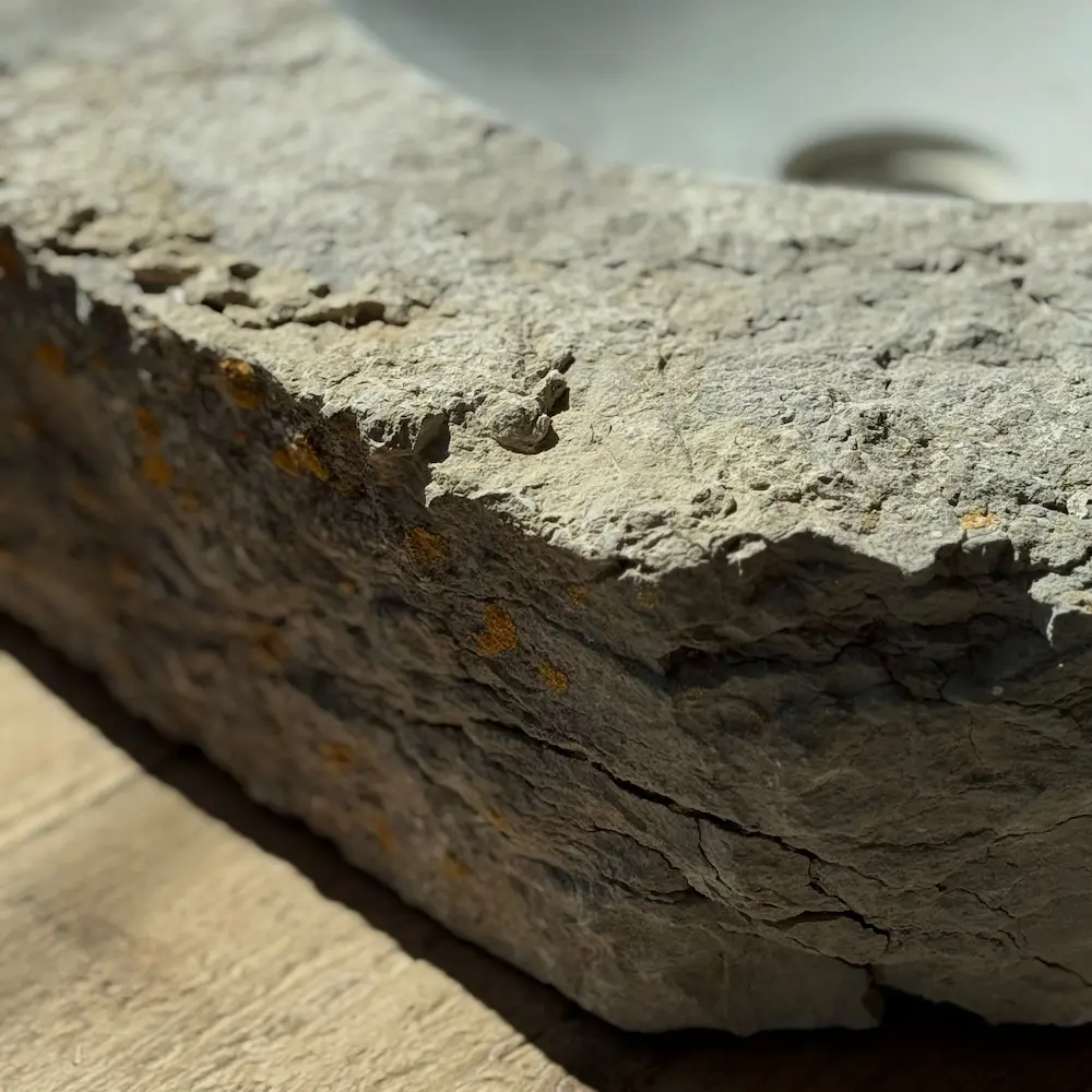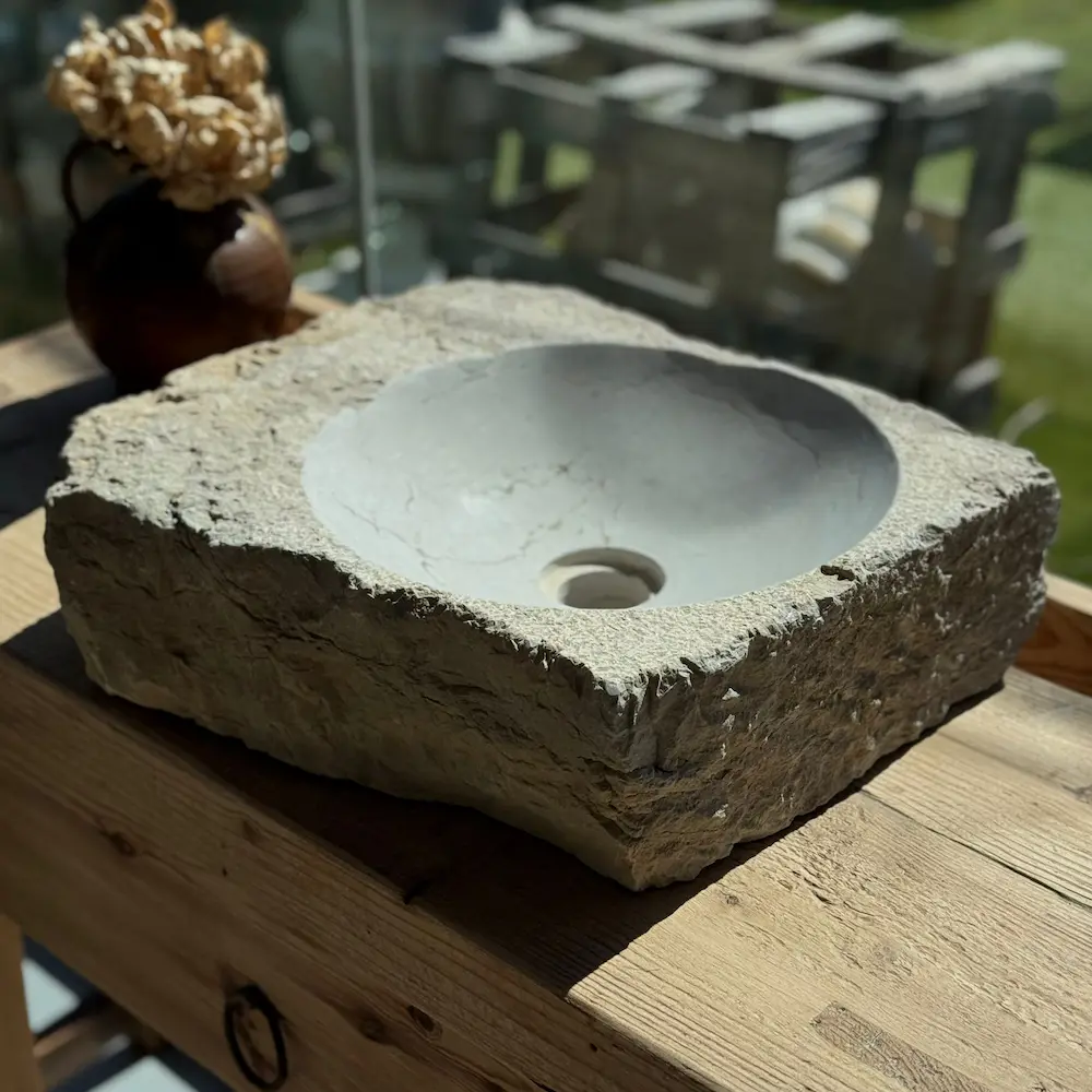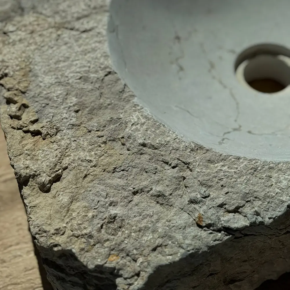 «Bolvir» es una pica única, esculpida a mano en piedra natural de Girona. Su acabado exterior totalmente rústico y su interior suavemente pulido en forma cóncava la convierten en una joya compacta, perfecta para baños con esencia de montaña y autenticidad.