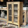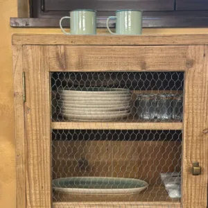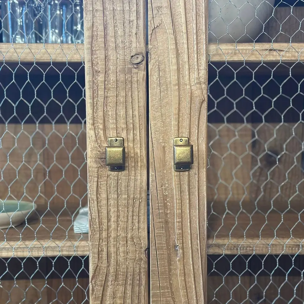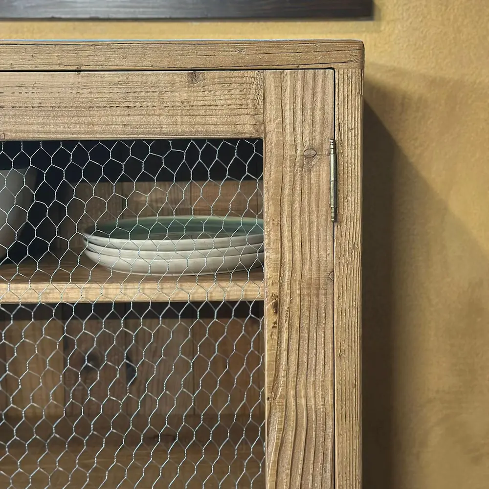 Mueble de inspiración farmhouse con frente en malla de gallinero y estructura de pino viejo recuperado. Su acabado rústico en color natural y tiradores de latón aportan calidez y carácter. Ideal para cocina, comedor o entrada para lucir objetos con encanto.