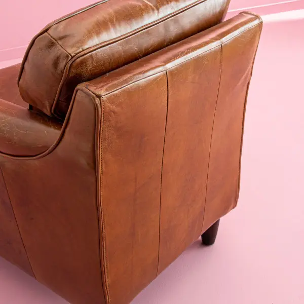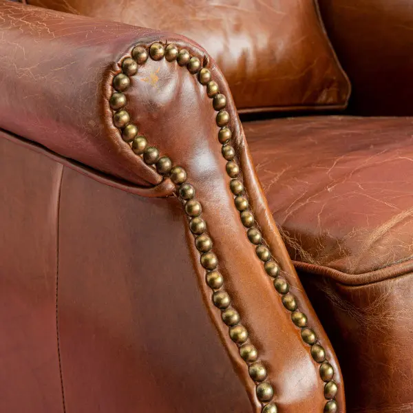 Los brazos curvados, el respaldo mullido y las tachuelas decorativas realzan su estilo tradicional con un toque contemporáneo. La suavidad del cuero envejecido y el acolchado generoso hacen de esta butaca una invitación al descanso.