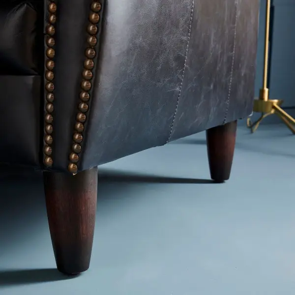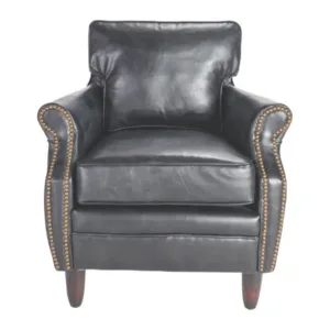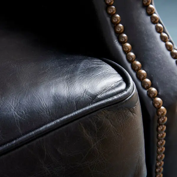 Los brazos curvados, el ribeteado con tachuelas metálicas y el asiento mullido garantizan comodidad y estilo. Su estructura compacta y equilibrada la hace perfecta para salones, despachos o rincones de lectura donde se busque una pieza elegante pero funcional.