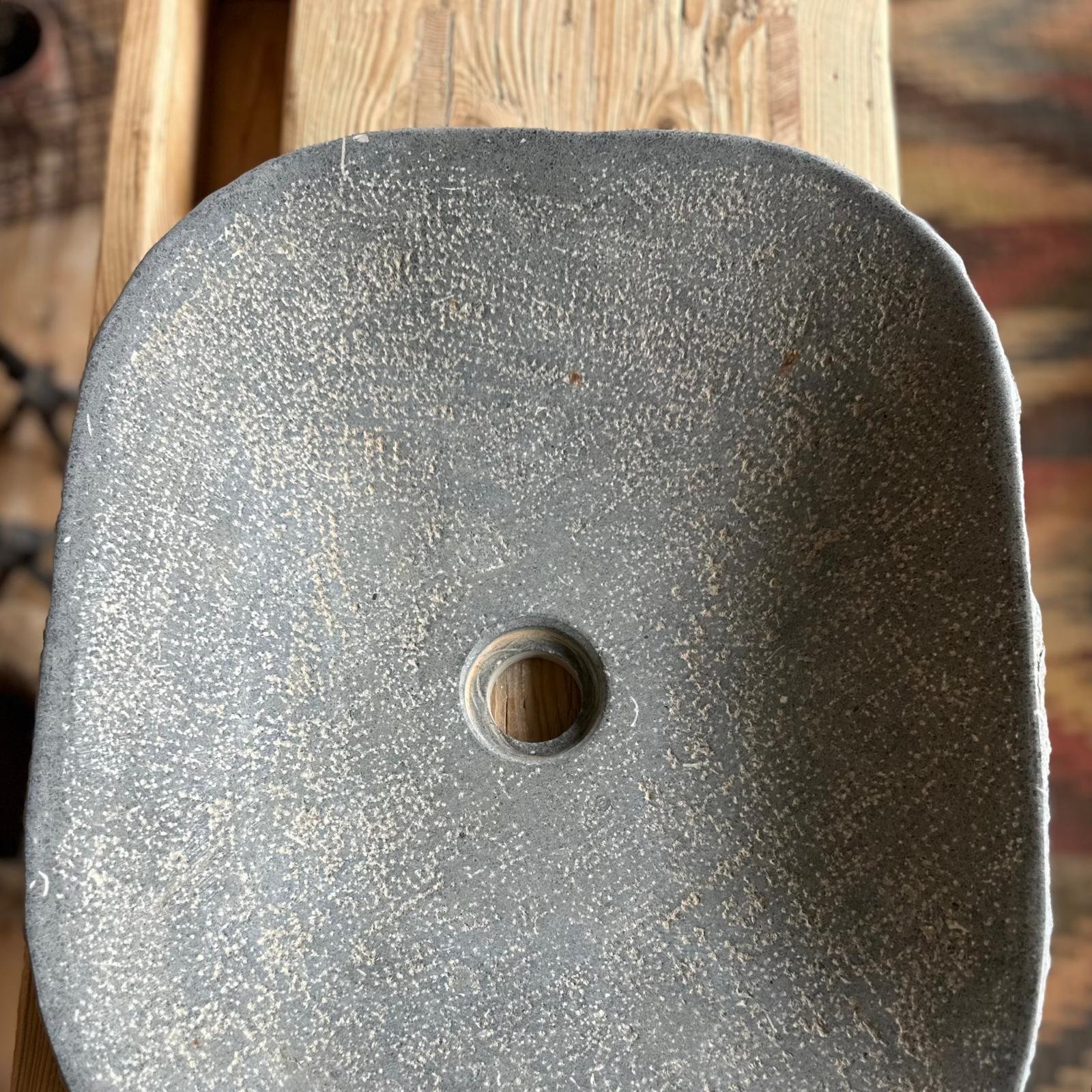 La pica "Cenia" es un tributo a la piedra en estado puro. Su superficie exterior mantiene la textura natural del bloque original, mientras que el interior, suavemente trabajado, respeta la forma orgánica del material. Su tono gris terroso, salpicado de matices más oscuros, aporta profundidad visual y una sensación de autenticidad difícil de imitar.