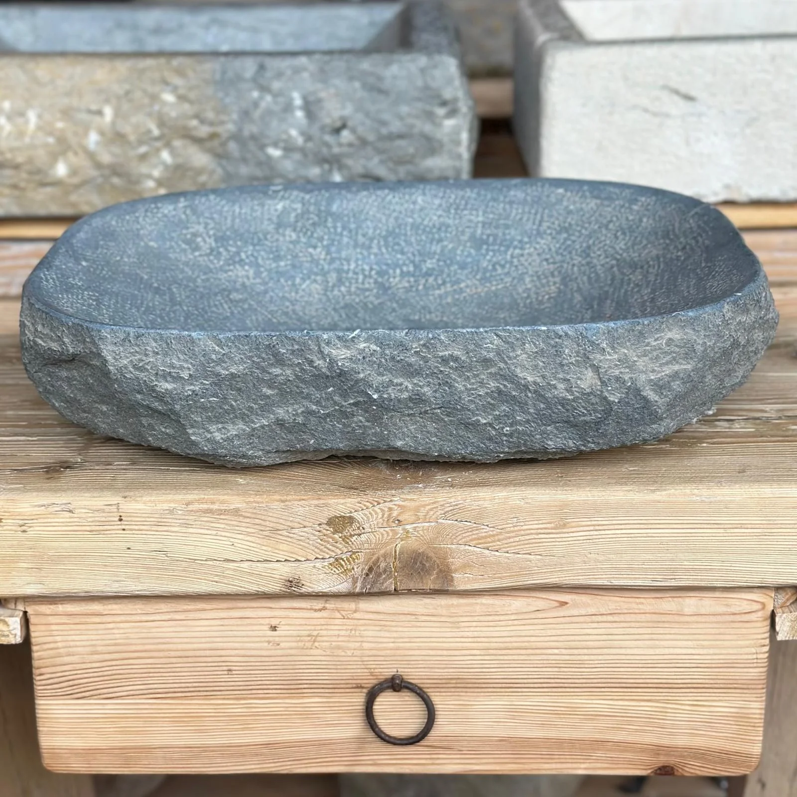 Sólida, sobria y auténtica, «Cenia» está tallada a mano en piedra natural de Tarragona. Su textura marcada y su color grisáceo la convierten en una pieza con carácter propio, ideal para baños con esencia mineral y natural.