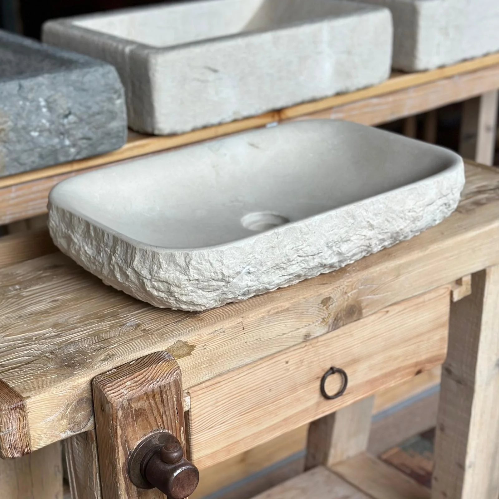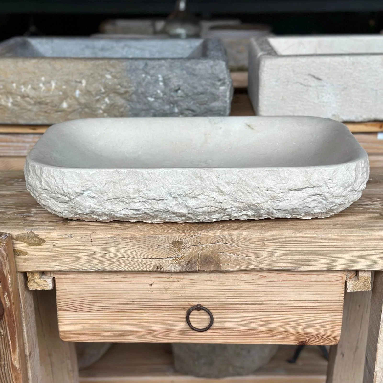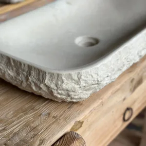 "Empordanesa" es una pica que respira calma. Su diseño alargado, de bordes redondeados y textura natural, la convierte en una pieza atemporal ideal para baños que buscan una atmósfera sencilla, cálida y con carácter. Tallada completamente a mano en piedra natural Crema Marfil, conserva la textura rugosa del exterior contrastando con el interior pulido, creando un equilibrio entre naturaleza y comodidad.
