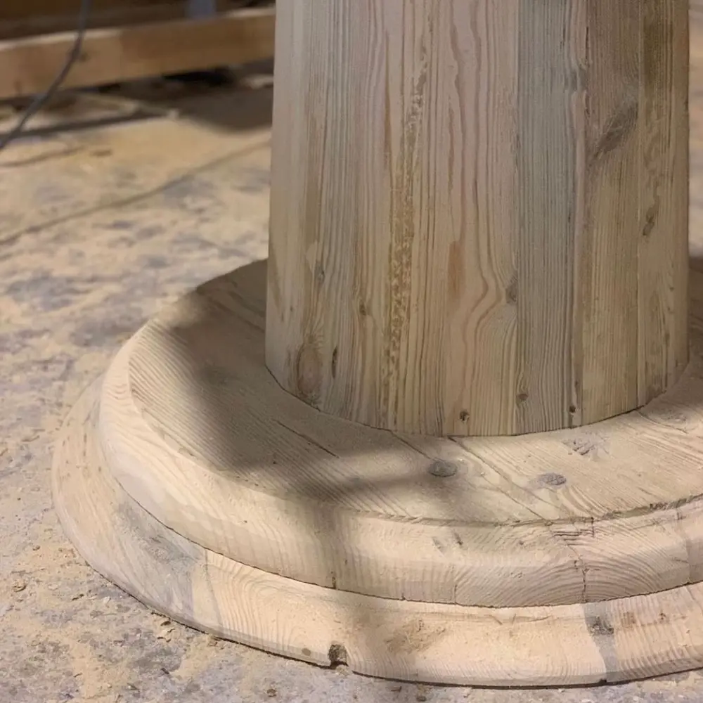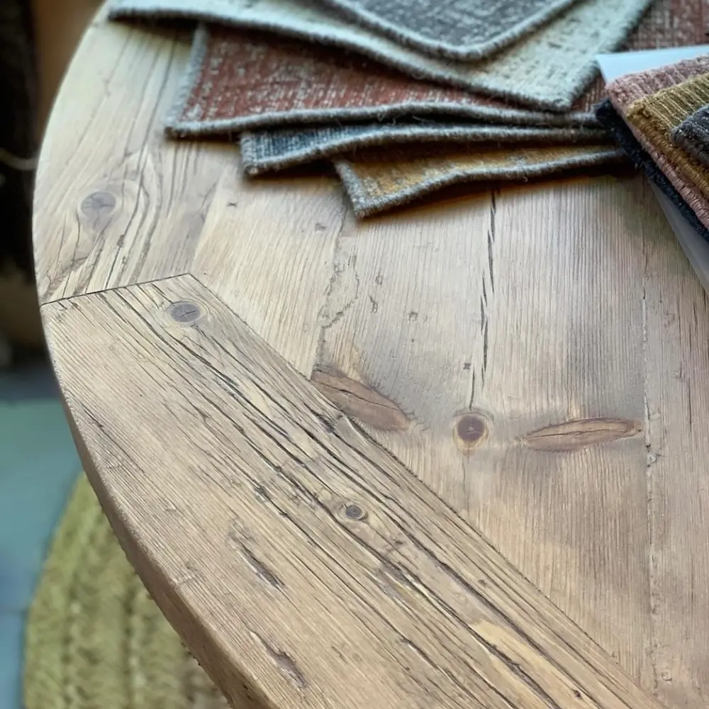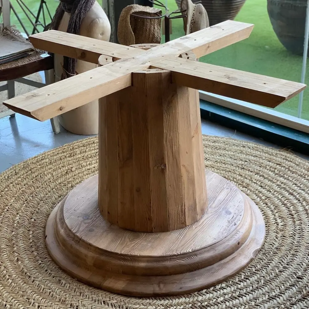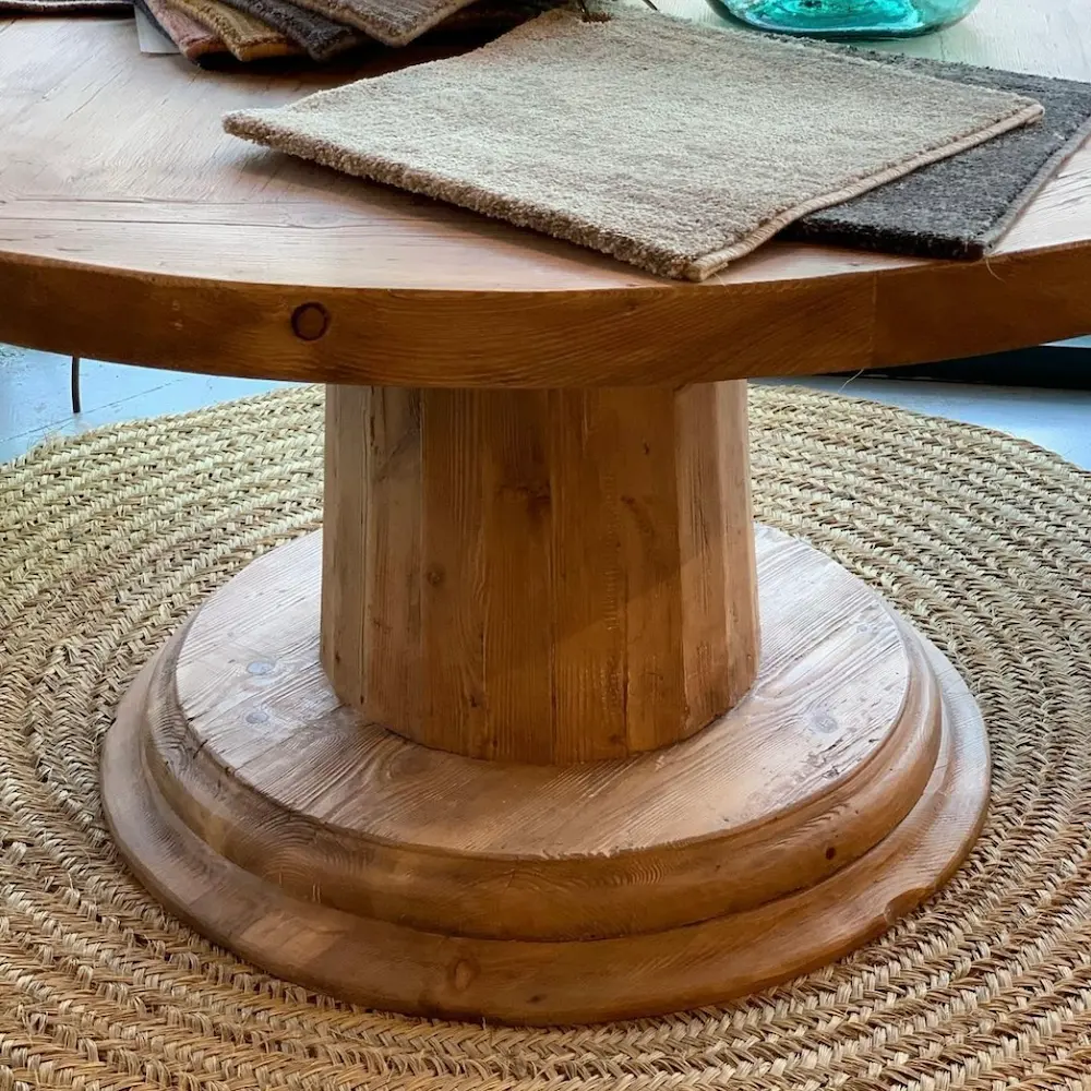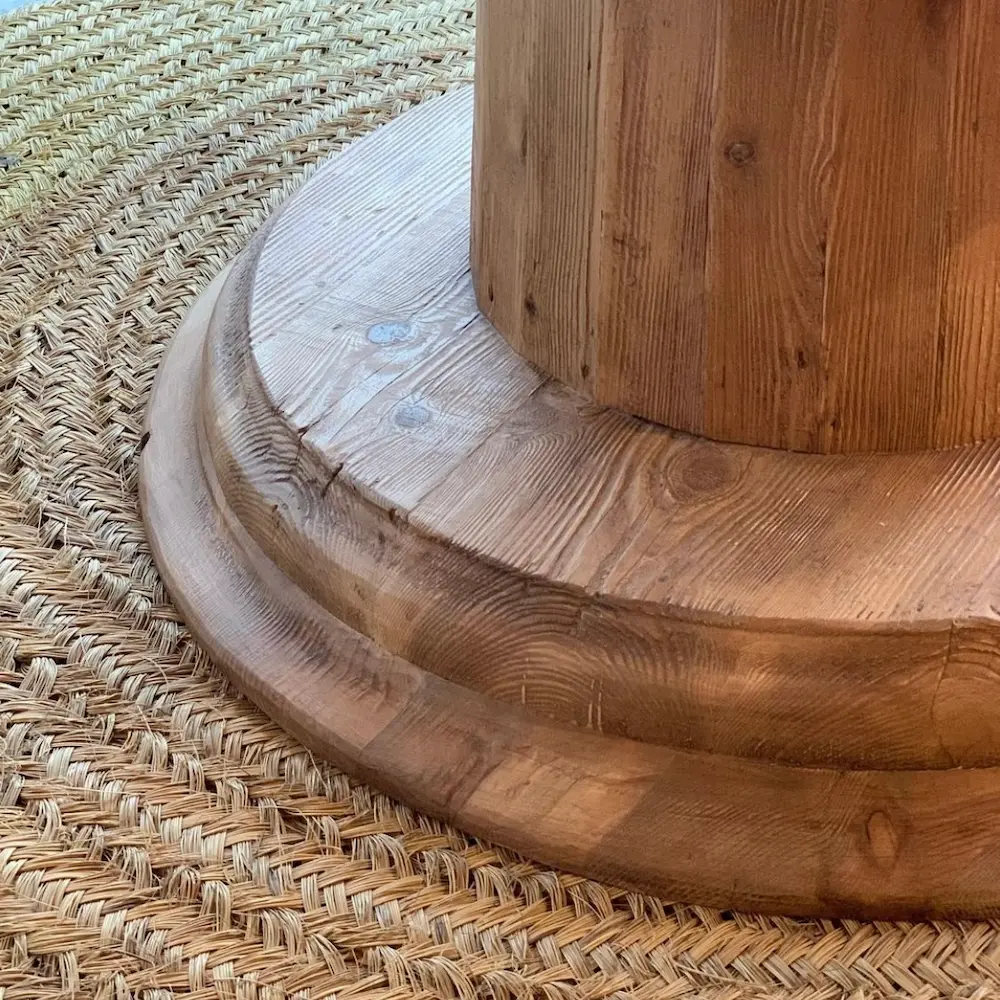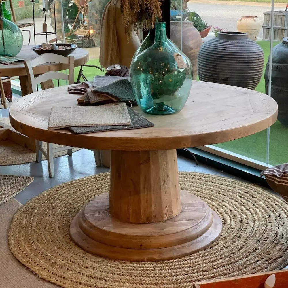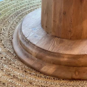 Mesa fabricada en pino viejo recuperado, con sobre redondo octogonal en acabado tostado T003 y pata central robusta que aporta elegancia y estabilidad.