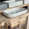 La pica «Fitor» está tallada en piedra recuperada, aportando autenticidad y sostenibilidad. Su acabado exterior en bruto conserva la esencia de la roca, mientras que el interior pulido ofrece comodidad y practicidad. Una pieza única que combina diseño rústico, respeto al entorno y carácter artesanal.