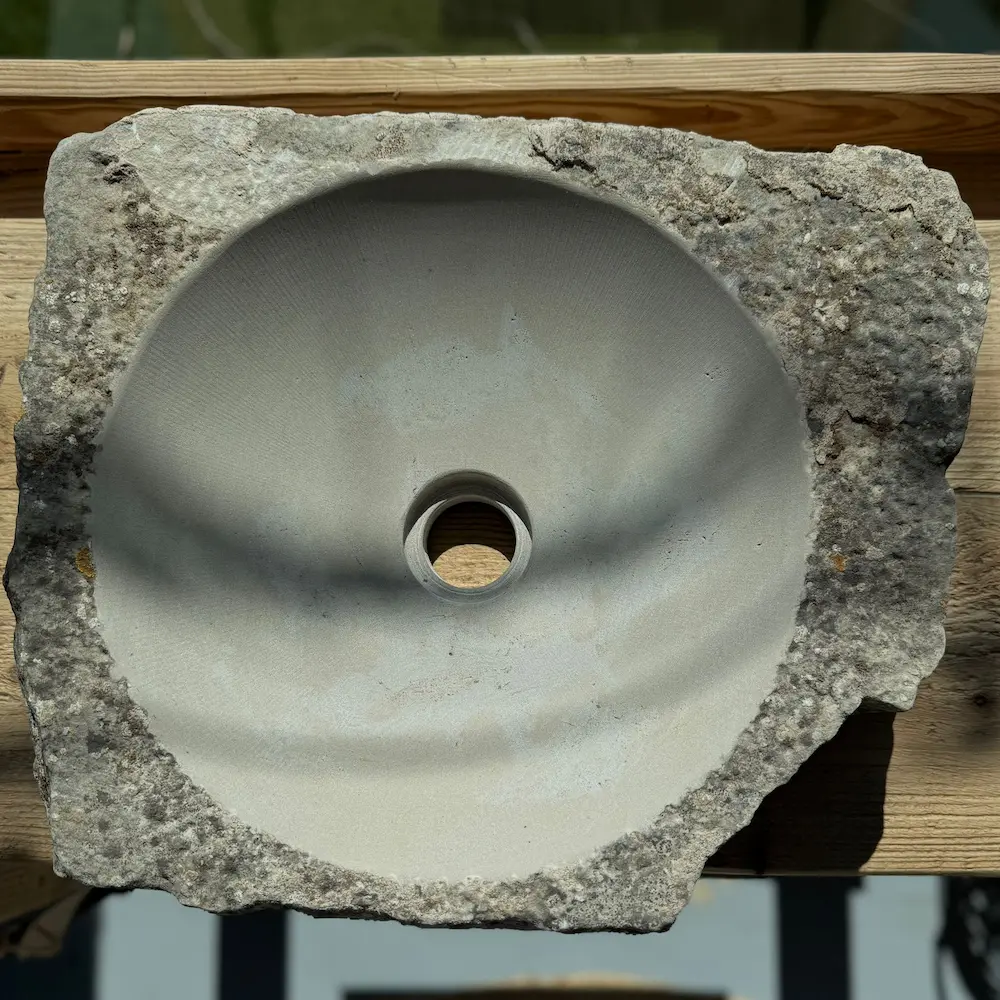"Gironina" es una de esas piezas que enamoran por su sencillez y naturalidad. Con un exterior totalmente irregular que respeta la forma original del bloque de piedra y un interior cóncavo finamente pulido, esta pica es perfecta para espacios que buscan autenticidad en cada rincón.