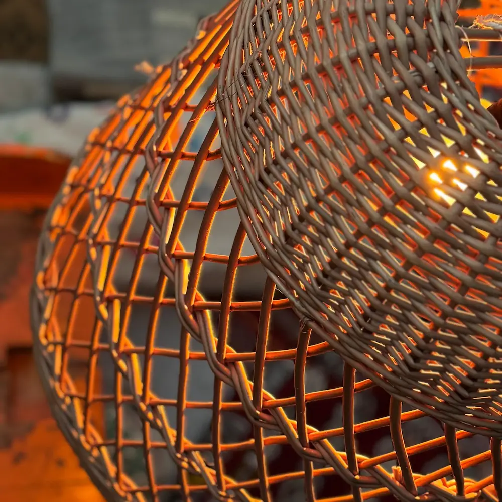 “Celistra” es una lámpara de techo con un carácter especial. Su trenzado artesanal permite que la luz se filtre suavemente, dibujando sombras cálidas que envuelven el espacio con una atmósfera íntima y natural.