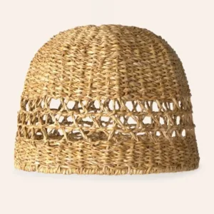 La lámpara “Malia” combina simplicidad y carácter en una pieza compacta y versátil. Su diseño, trabajado completamente a mano en junco de mar, alterna un tejido cerrado en la parte superior e inferior con un entramado abierto que deja que la luz respire y dibuje sombras cálidas allí donde se instala.