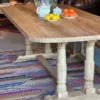 Mesa de comedor fabricada en pino viejo recuperado, con acabado rústico y color blanqueado (T001). El sobre, de 5/6 cm de grosor, presenta un diseño con listón horizontal en las puntas que realza su carácter artesanal. Las patas talladas a mano aportan solidez y un encanto único.