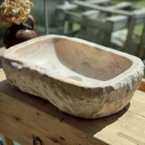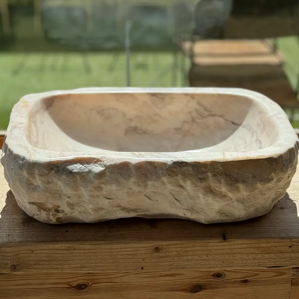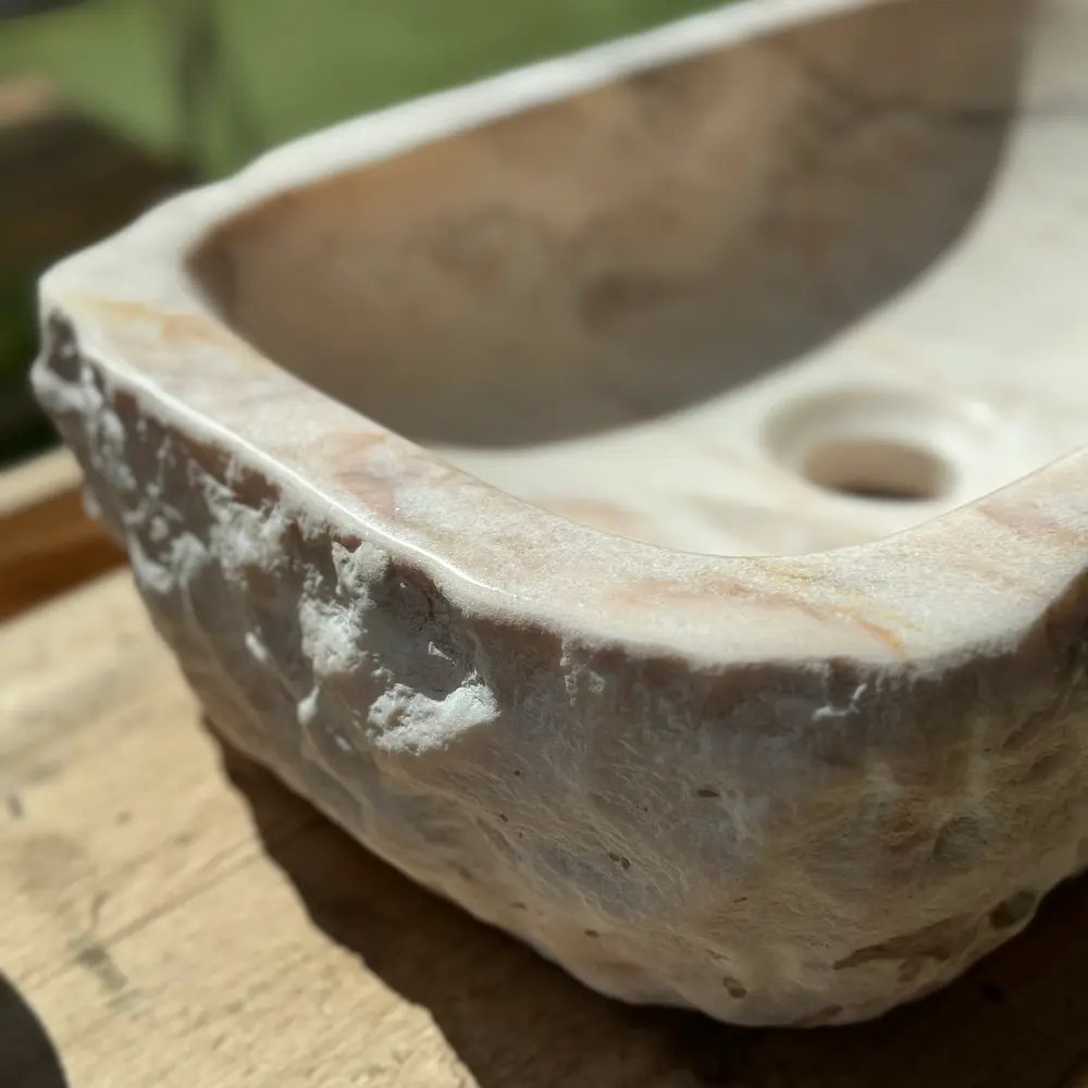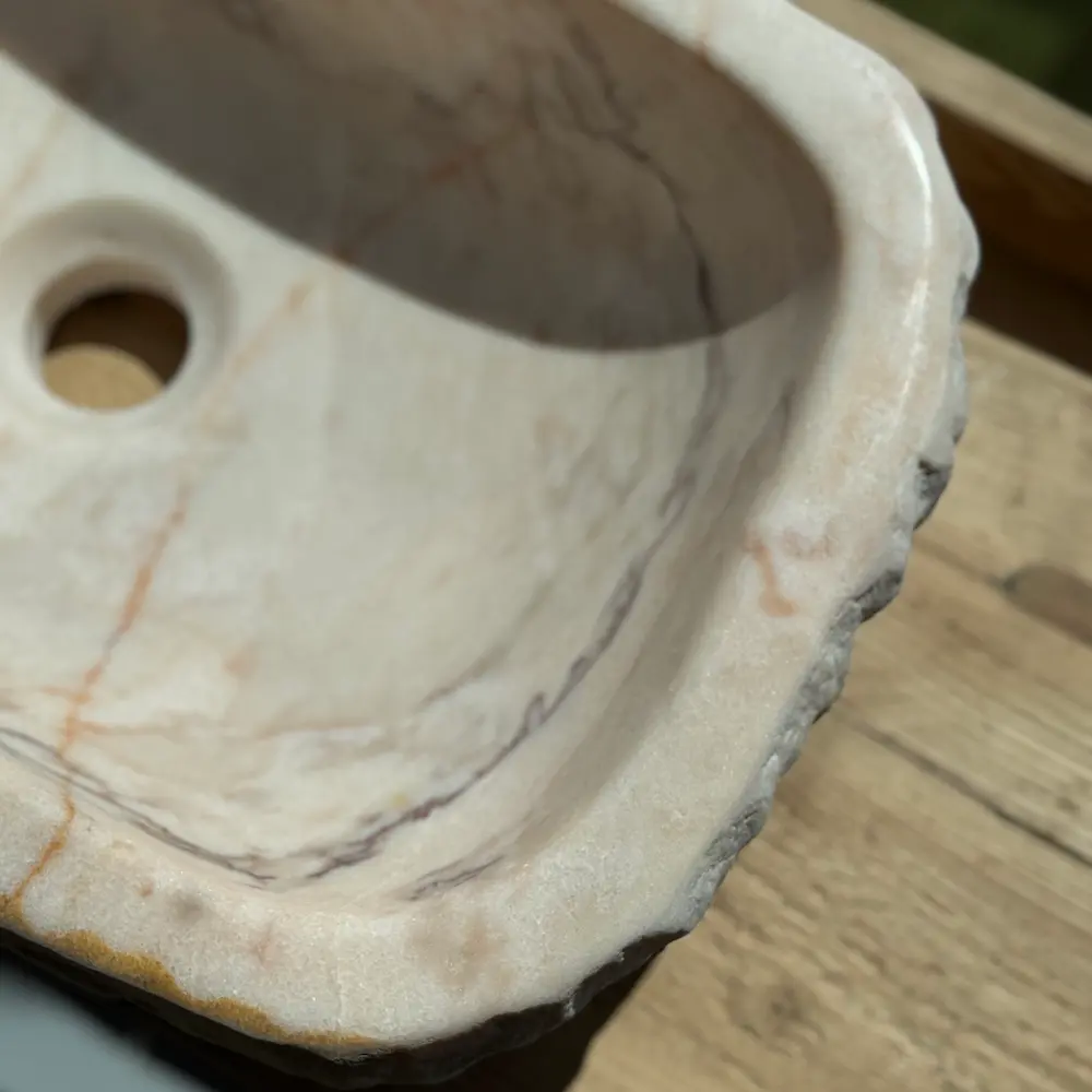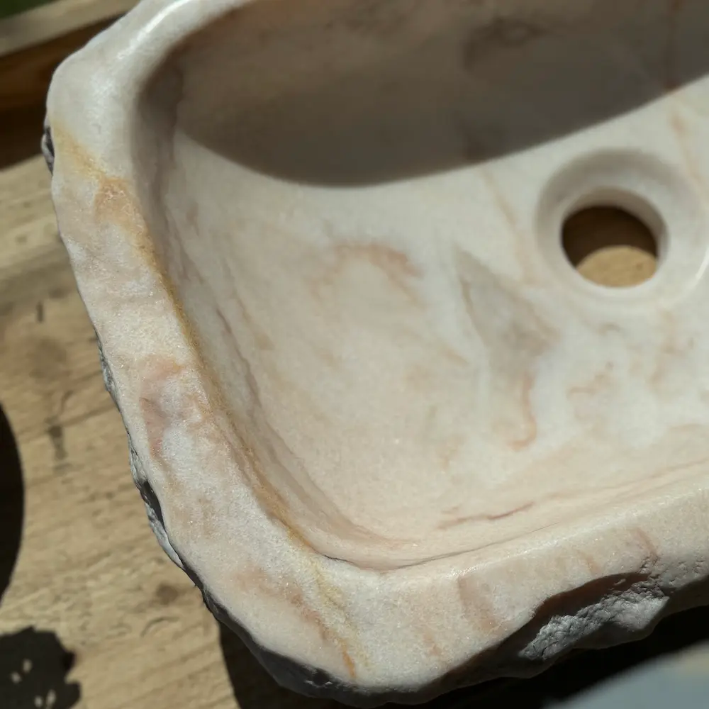 Los tonos crema y rosados, con vetas únicas, otorgan una calidez y elegancia difíciles de igualar. Esta pieza es ideal para quienes buscan un lavabo con personalidad, que combine nobleza y artesanía en una sola forma.