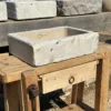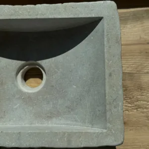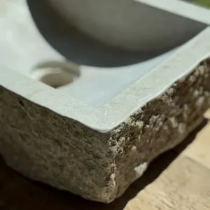 Pequeña pero imponente, «Mini Talaia» está tallada a mano en piedra natural de Girona. Su diseño compacto y geométrico, con interior pulido y exterior en bruto, es ideal para aseos pequeños o espacios donde cada centímetro cuenta sin renunciar a la artesanía y el estilo.