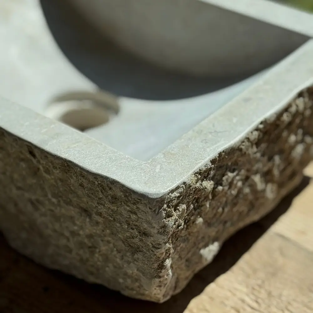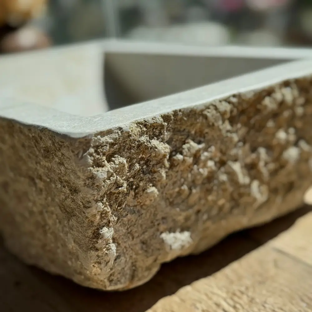 Tallada a mano en piedra de Girona, esta pieza combina un exterior rugoso y auténtico con un interior suavemente pulido en forma de cuenco profundo. Su forma rectangular y proporciones armoniosas transmiten orden, equilibrio y una presencia contundente en su reducido formato.