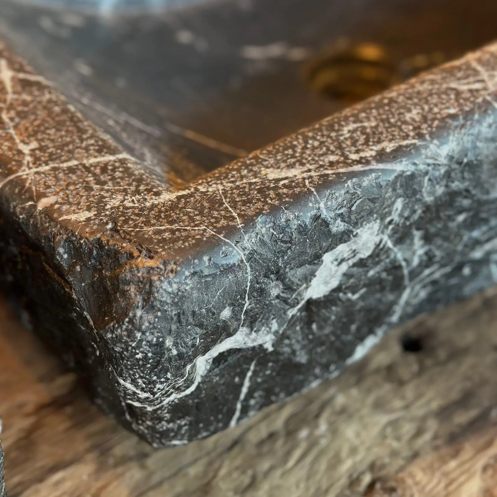 Lavabo sobre encimera en mármol Negro Marquina con vetas blancas. Exterior con borde natural y cuenco interior pulido de líneas rectas, que realzan su carácter escultórico. Elegante, duradero y pieza única para baños contemporáneos.