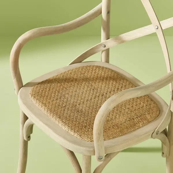 Inspiradas en el encanto de los cafés franceses, las sillas “Bistrot Lille” aportan elegancia y calidez natural a cualquier espacio. Su diseño con brazos curvados, respaldo cruzado y asiento de rejilla trenzada combina confort, estilo y autenticidad artesanal.