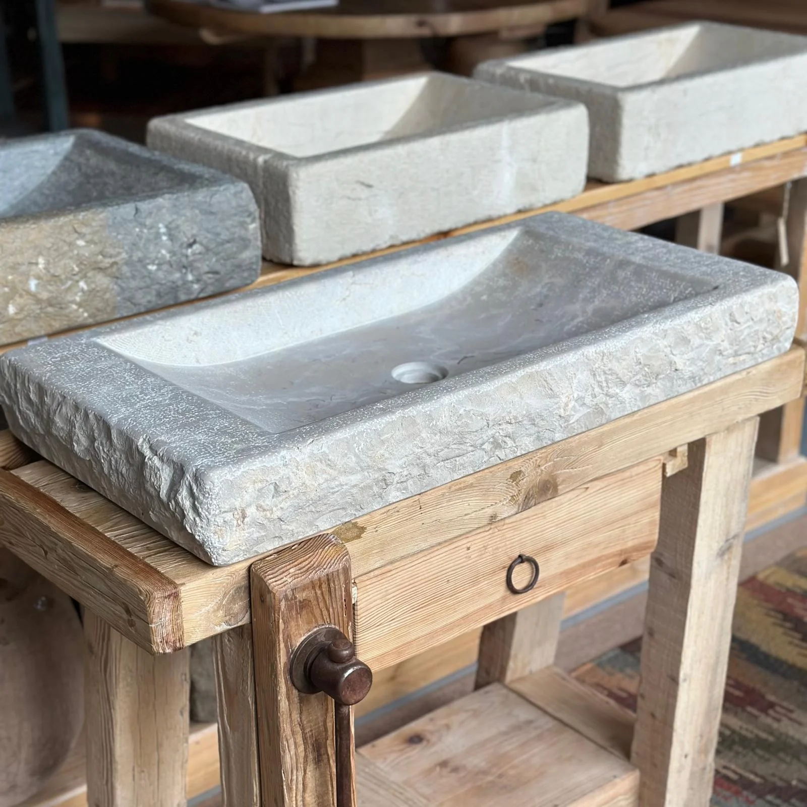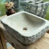 El exterior mantiene la textura viva del bloque original, mientras que el interior se pule con cuidado para ofrecer una superficie suave, cómoda y elegante. Su forma recta y baja permite integrar la pica sobre encimera con gran armonía visual.