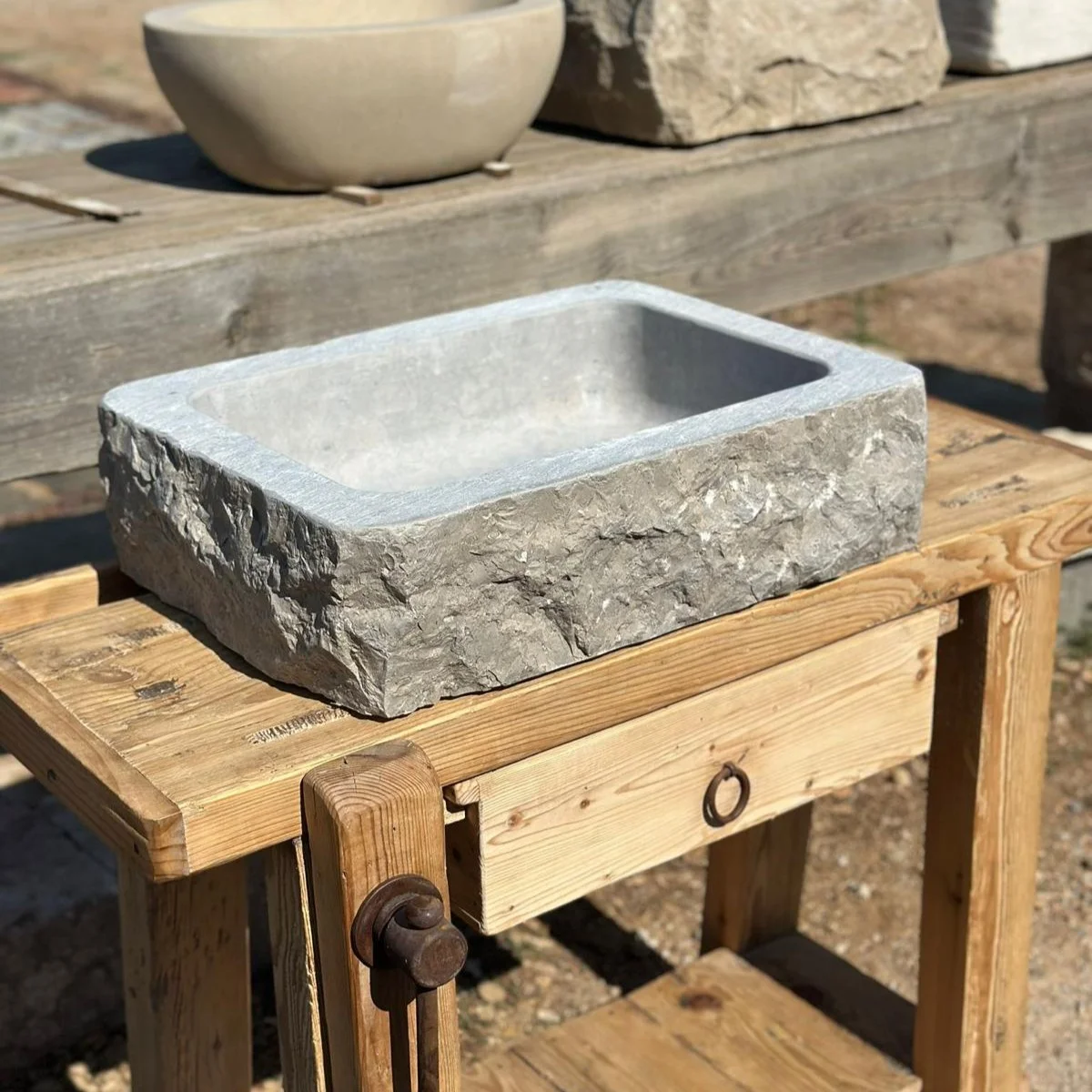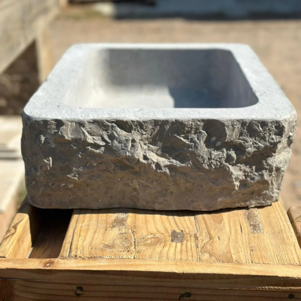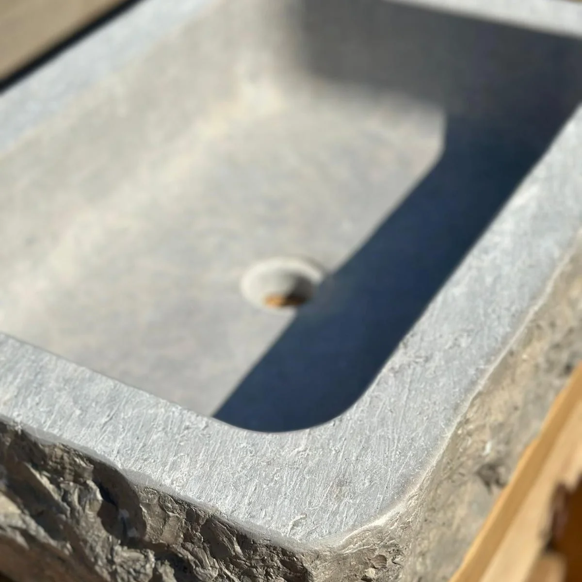 La pica «Pedraforca» combina la solidez de la piedra natural de Vinaixa con un diseño rectangular robusto y elegante. Su exterior rugoso conserva la esencia de la roca, mientras que el interior pulido aporta funcionalidad y sofisticación. Ideal para baños de estilo rústico, contemporáneo o mediterráneo.