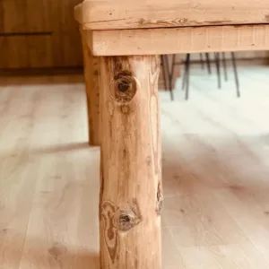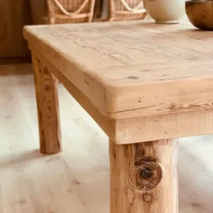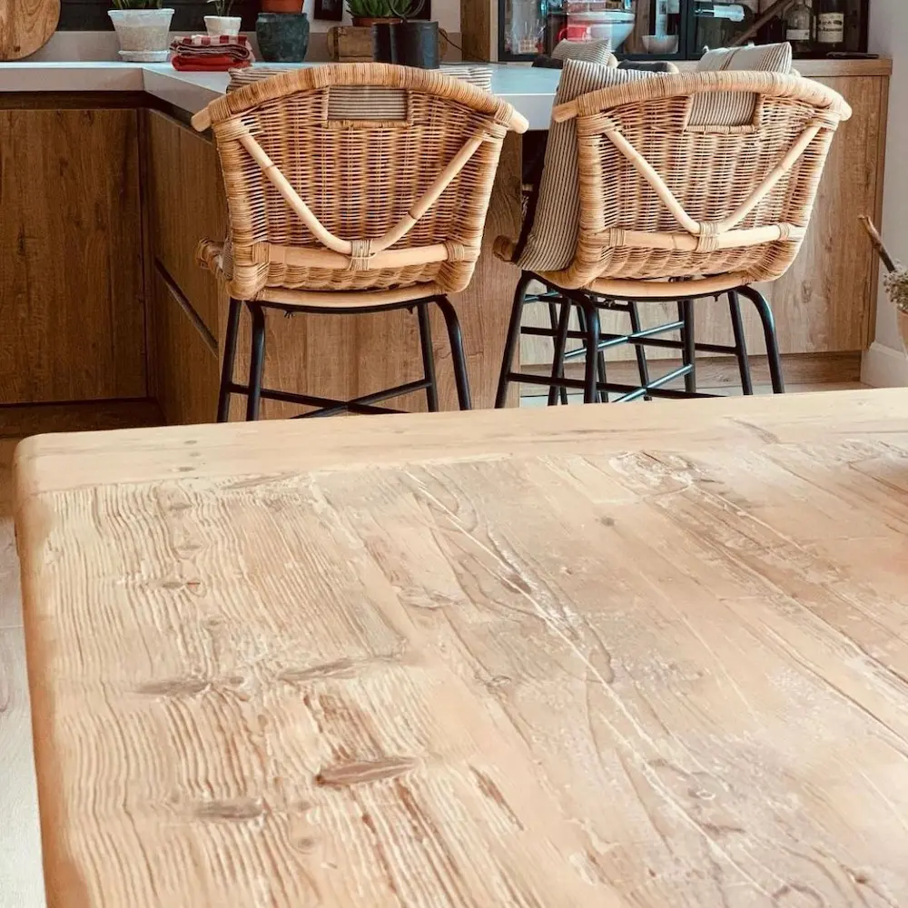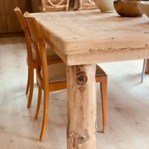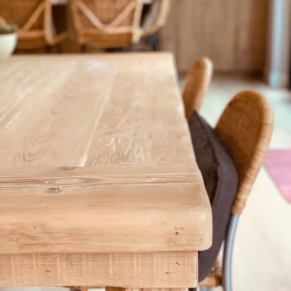 Cada mesa es única: las marcas, vetas y nudos del pino recuperado hacen de cada pieza un objeto exclusivo, con historia y personalidad propia.