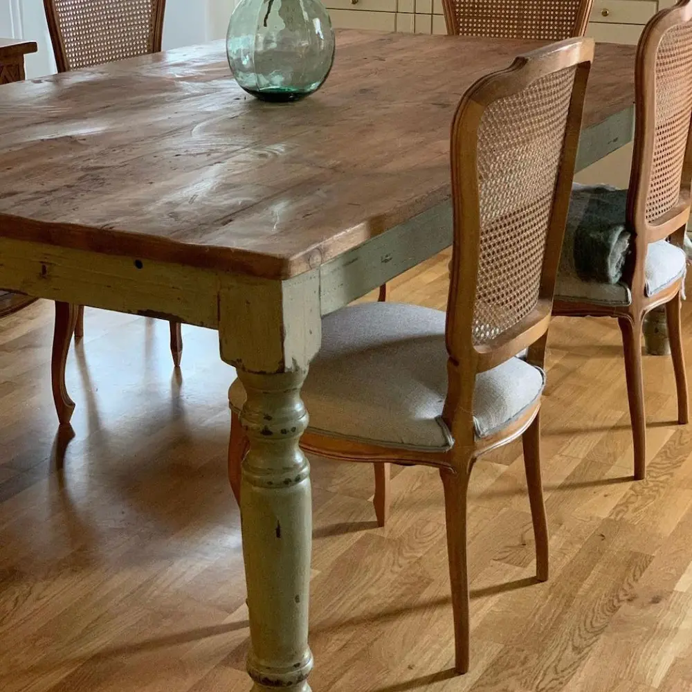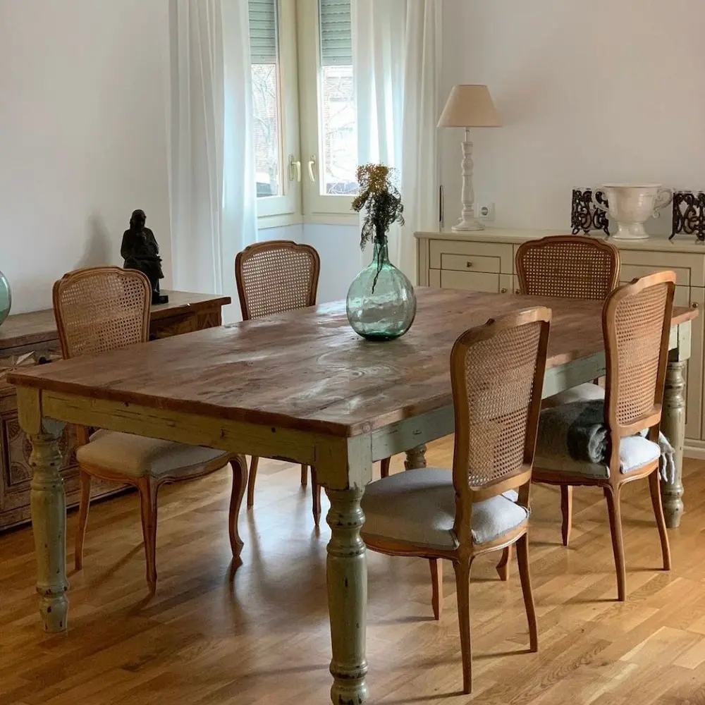 Las patas torneadas con pátina verde oliva añaden un contraste de color delicado y elegante, evocando la tradición mediterránea y el encanto de las casas de campo.