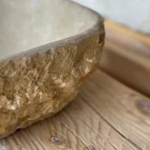 La pica «Siena» está tallada a mano en piedra de Tarragona, una roca natural de tonos cálidos y textura rústica. Su forma orgánica y acabado exterior en bruto contrastan con el interior suavemente pulido, creando una pieza única que transmite equilibrio entre naturaleza y diseño artesanal.