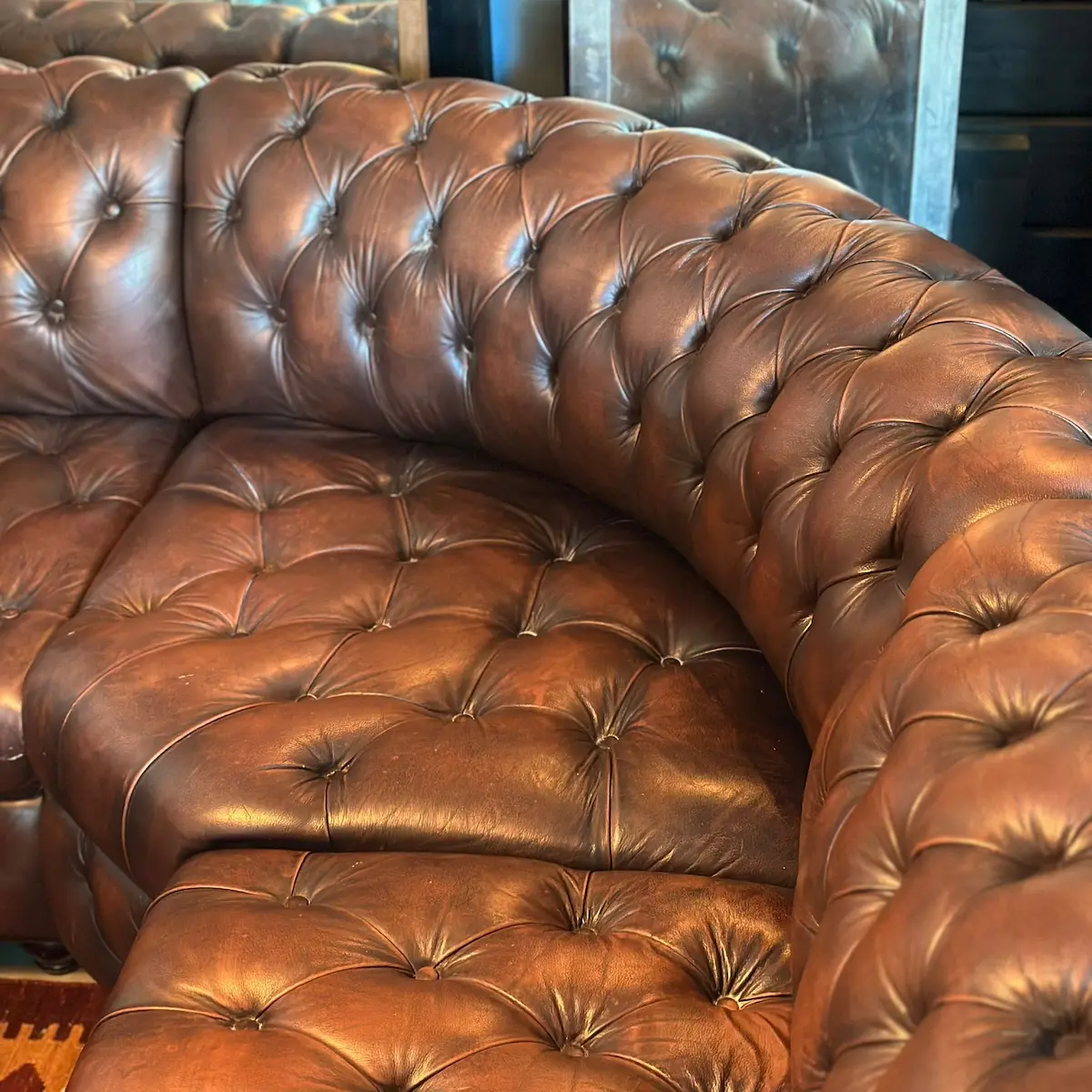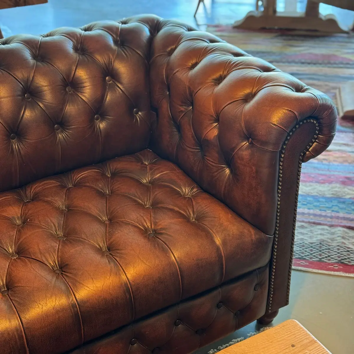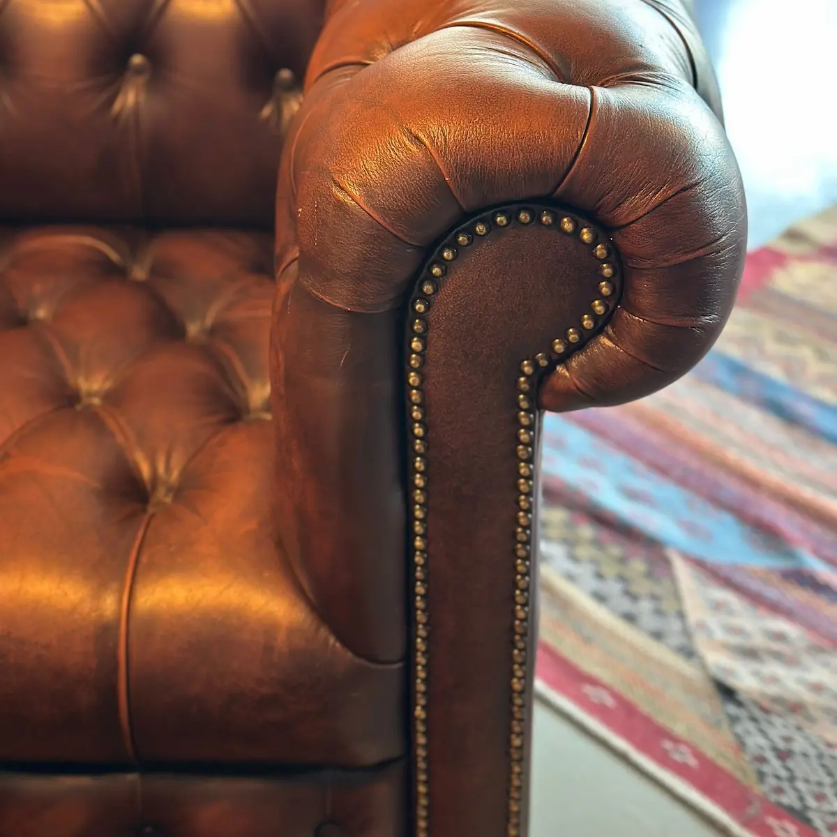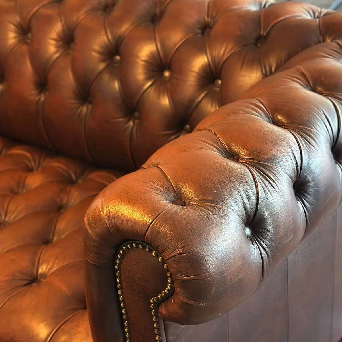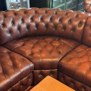 Chesterfield de los años 70 con su sello de autenticidad. El icónico estilo Chesterfield se reinventa en este sofá esquinero. Tapizado en piel genuina marrón, con capitoné profundo y remaches metálicos, ofrece elegancia atemporal y confort envolvente. Una pieza única y auténtica que viste cualquier espacio con carácter inglés clásico y distinción.