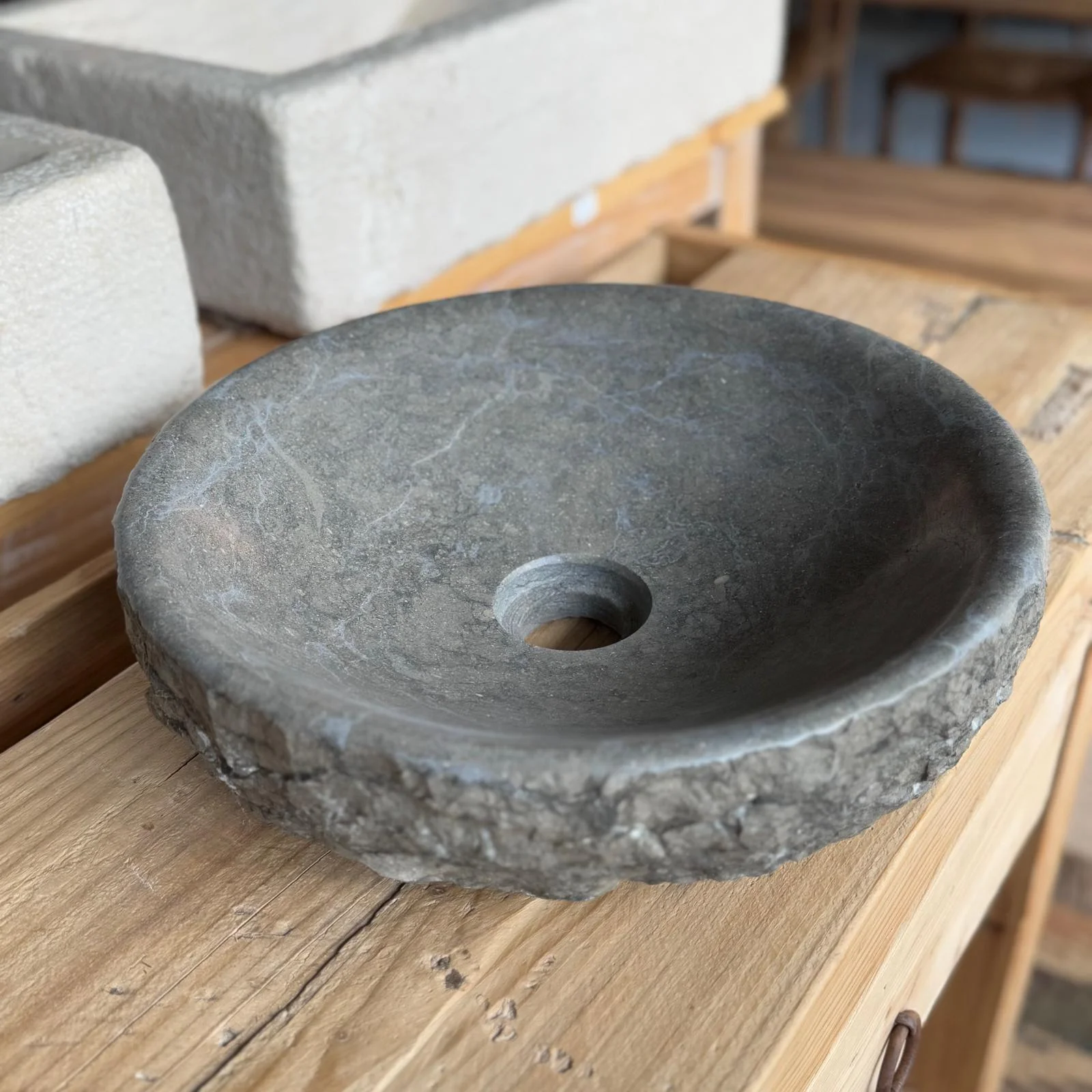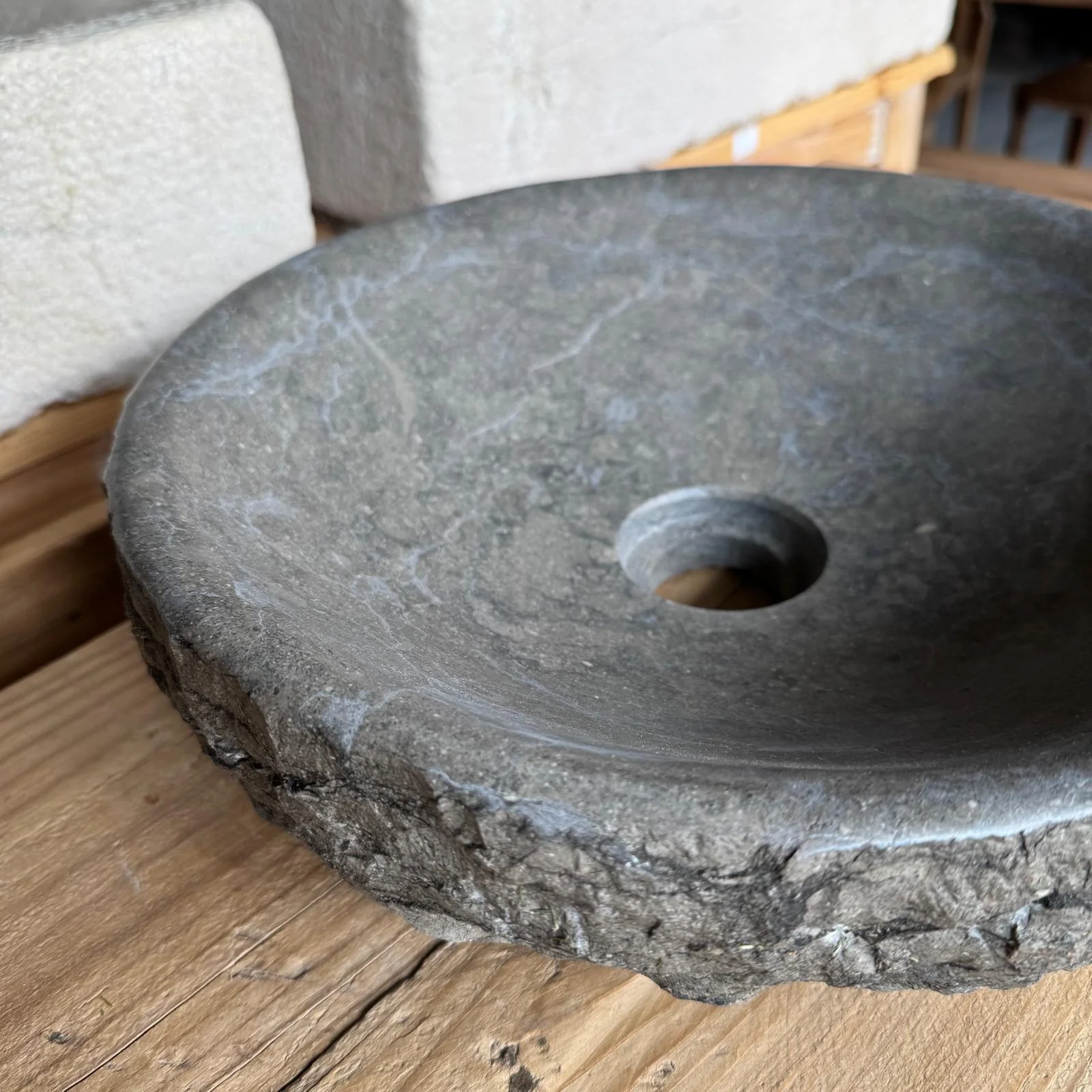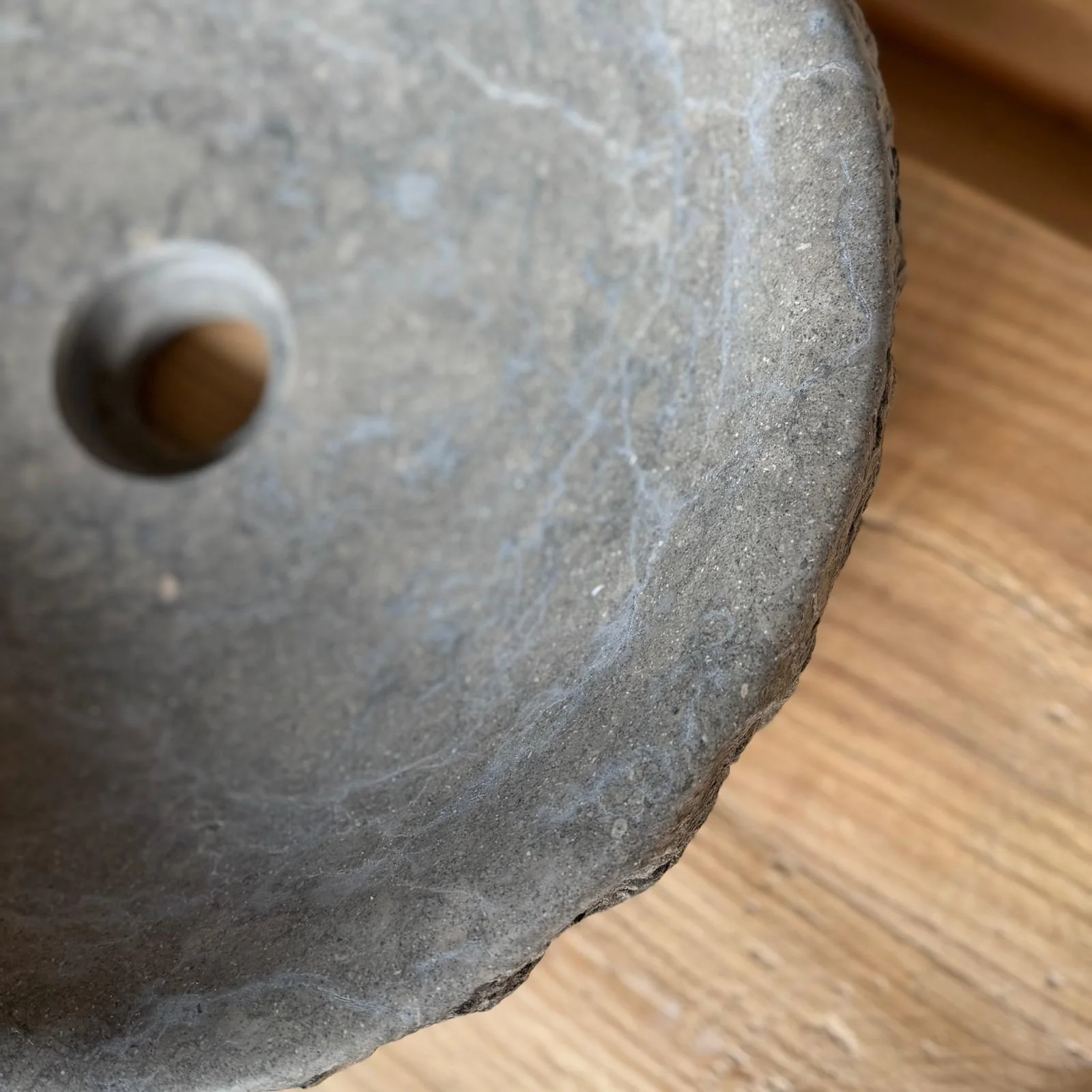 🪨 Material: Piedra natural oscura de Tarragona, exterior en bruto e interior pulido