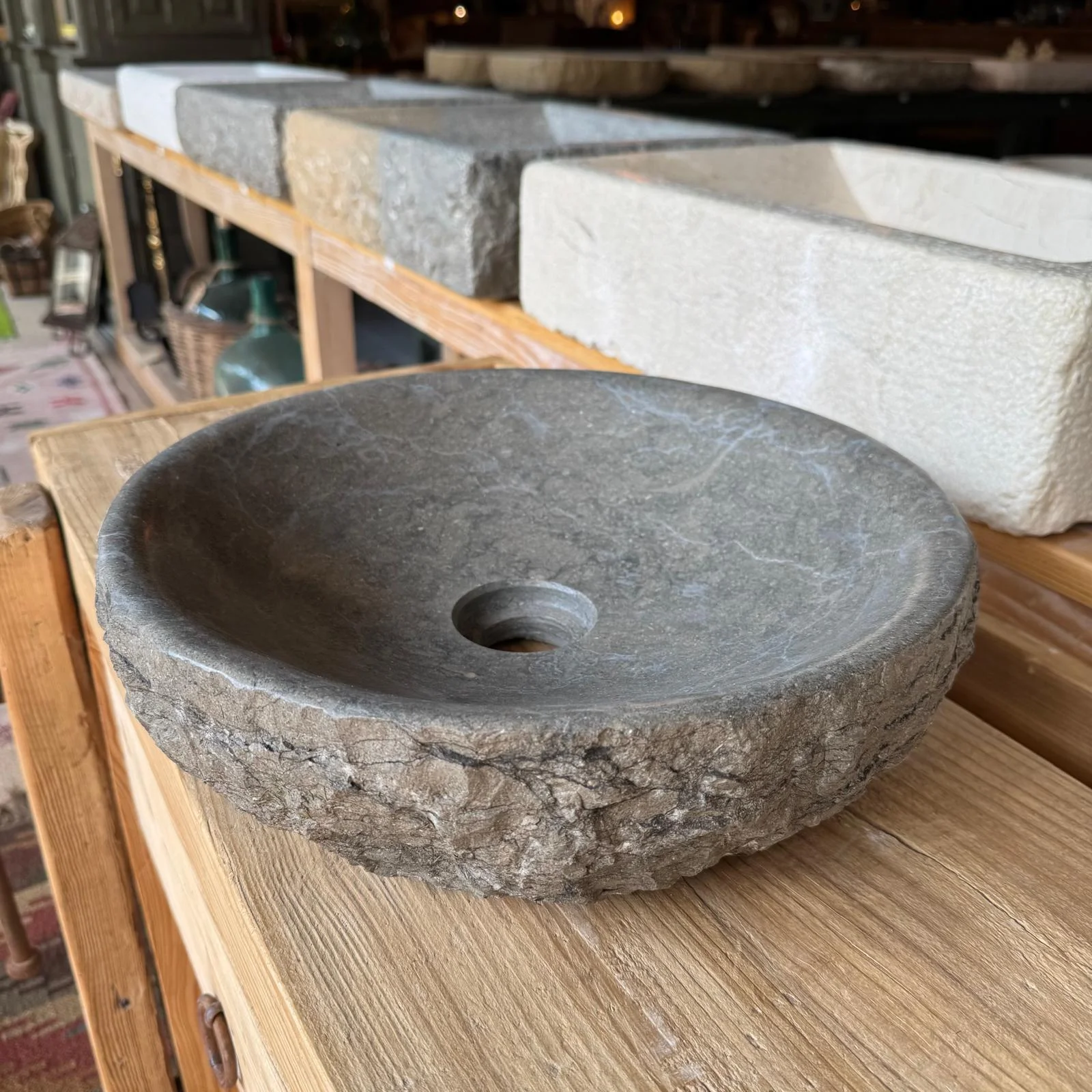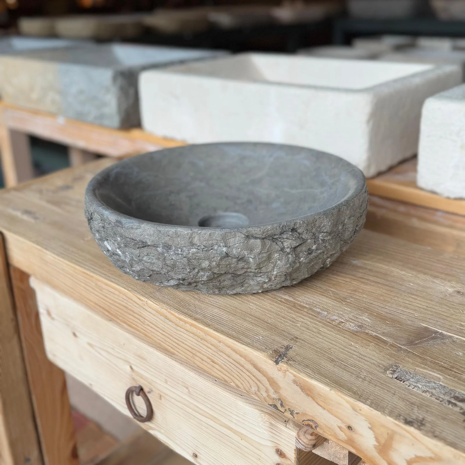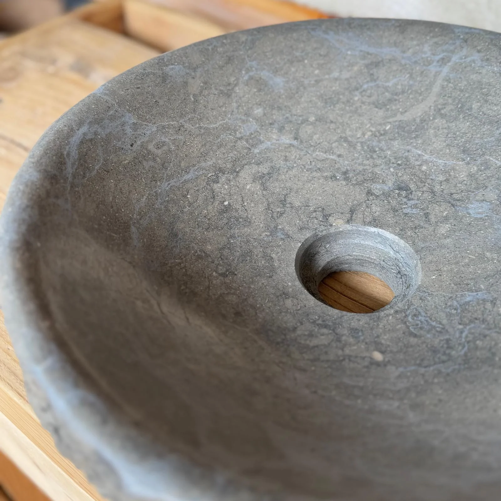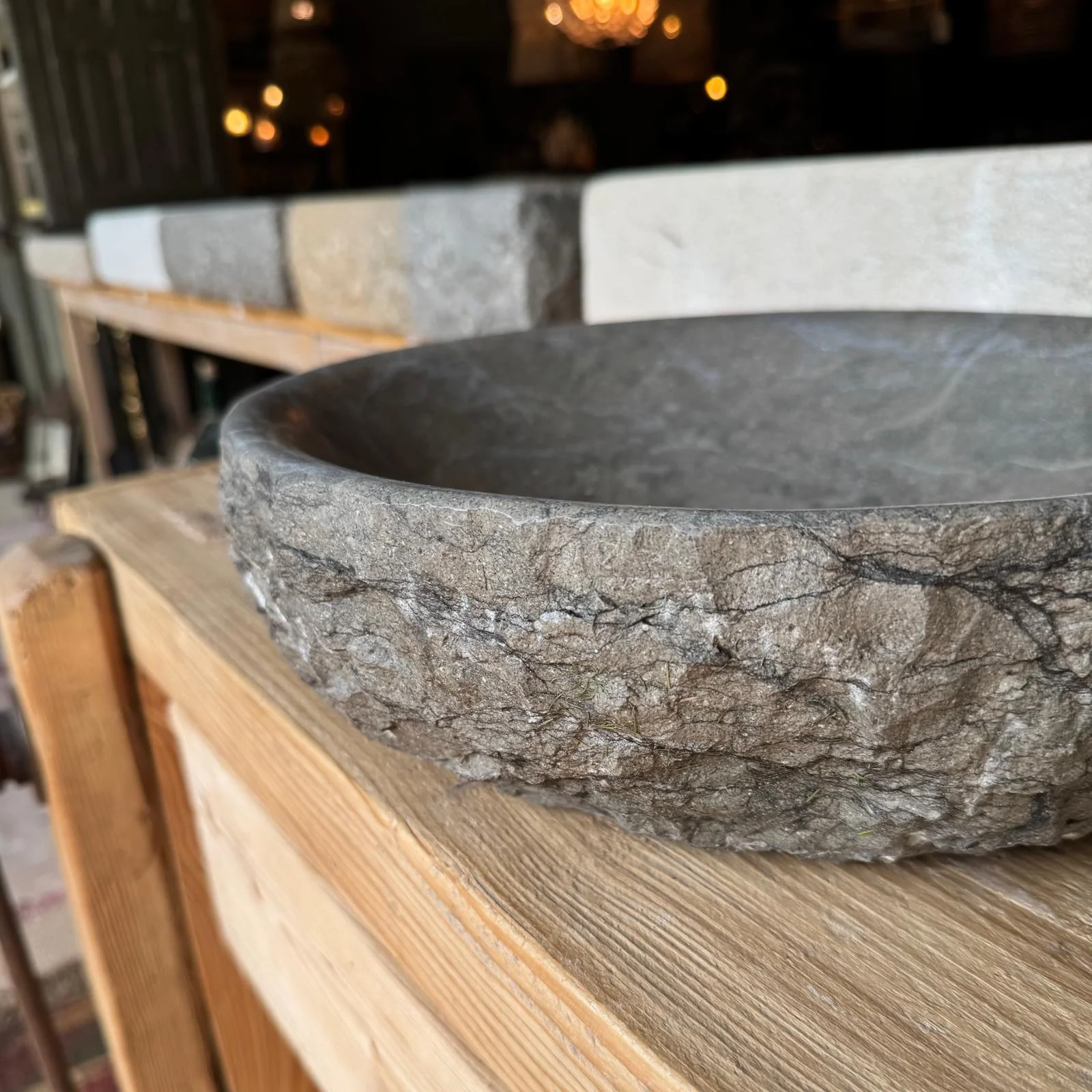 🪨 Material: Piedra natural oscura de Tarragona, exterior en bruto e interior pulido