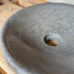La pica «Vallfogona» está tallada en piedra natural oscura de Tarragona. Su acabado exterior rústico contrasta con el interior pulido, logrando una pieza equilibrada entre fuerza y refinamiento. Su diseño redondo la convierte en una opción ideal para baños con carácter natural y artesanal.