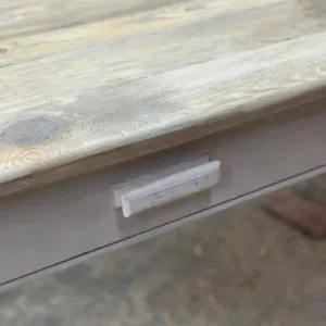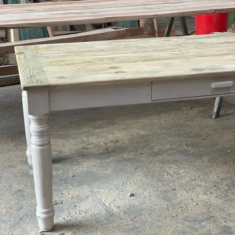 Mesa fabricada en pino viejo recuperado, con sobre en acabado liso texturizado y nuestro color blanqueado (T001). El diseño incluye listones horizontales en las puntas y patas torneadas con una sutil pátina en color blanco roto, que resaltan su aire mediterráneo. Dispone de un cajón central con tirador de madera, práctico y discreto.